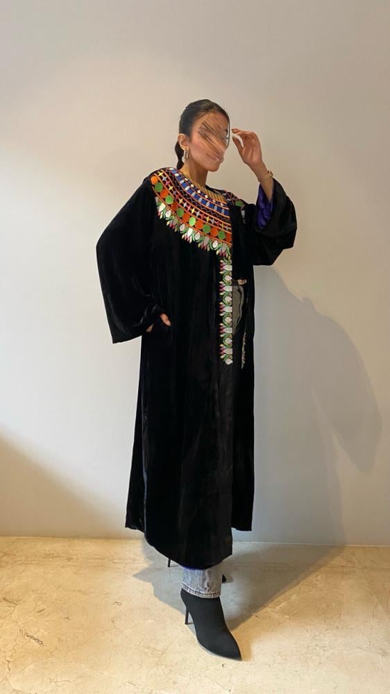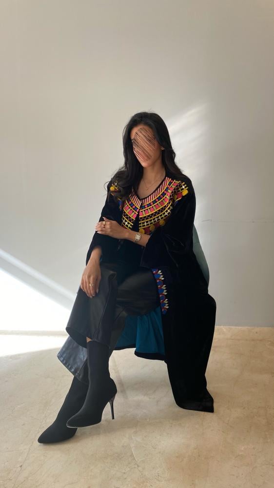 - العباية مصنوعة من خامة المخمل الناعمة والفاخرة التي توفر الراحة والدفء. الطرحة الشيفون تضيف لمسة خفيفة وأنيقة، مع النقوش الرقيقة التي تزيد من جمال الإطلالة.