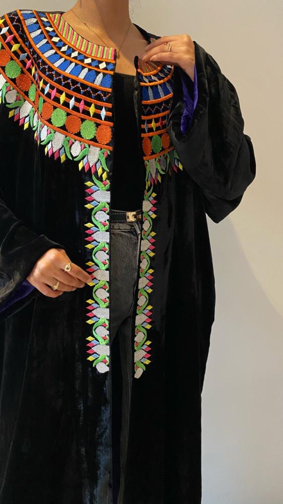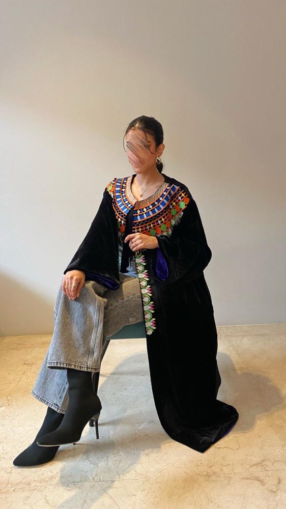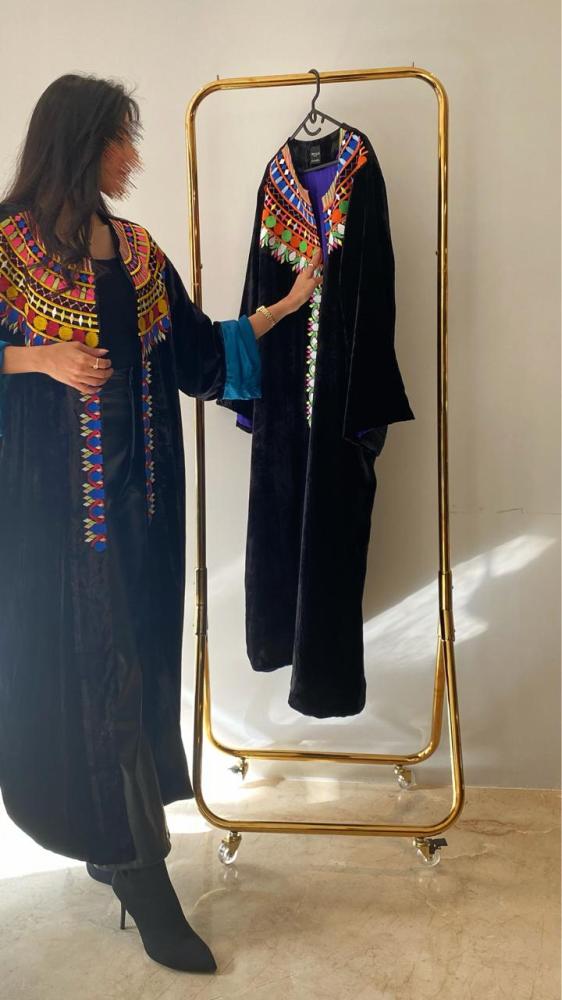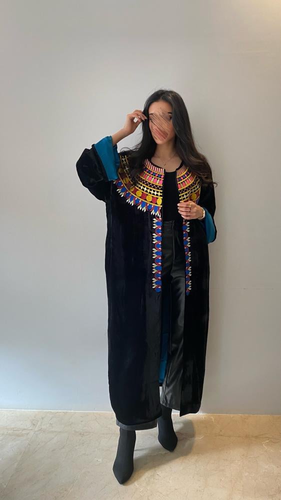 - تتميز العباية بتصميم عصري مع نقوش دقيقة على الأكمام والياقة، مما يعكس تناغمًا رائعًا بين الفخامة والبساطة. اللون الداكن للعباية يبرز النقوش بألوانها الجميلة.