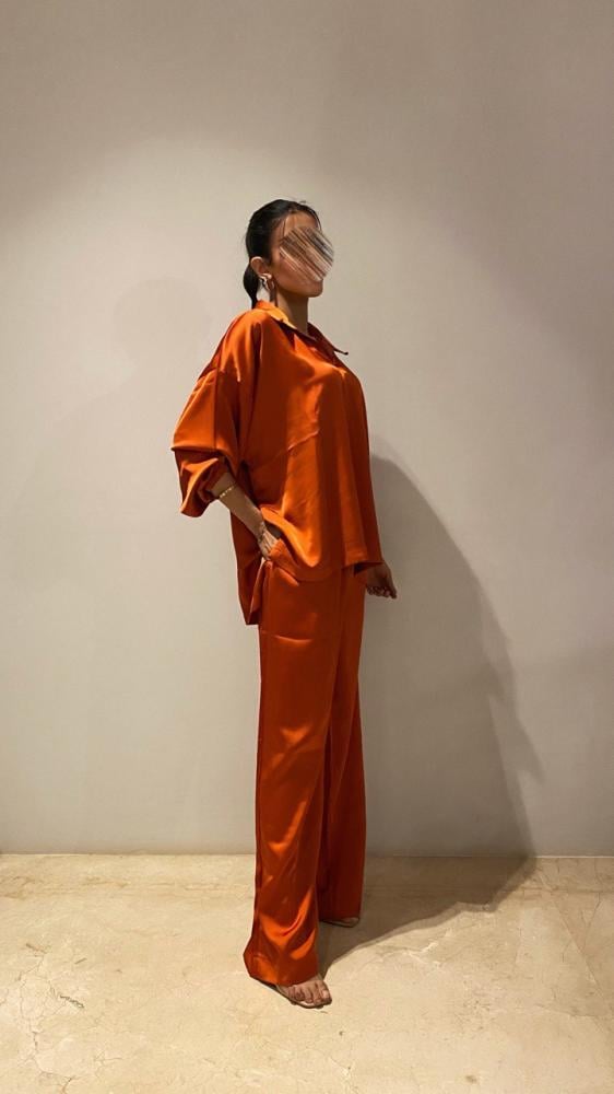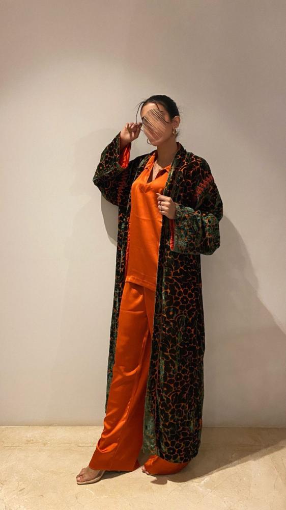 • سوت يتكون من بلوزة و بنطال سادة باللون البرتقالي الغامق الذي يضفي توازنًا رائعًا مع العباية المشجرة. الخامة تتميز بالنعومة والمتانة، مما يوفر لك راحة طوال اليوم، بالإضافة إلى تصميم يتناسب مع الأذواق العصرية ويعزز من إطلالتك بشكل متكامل.